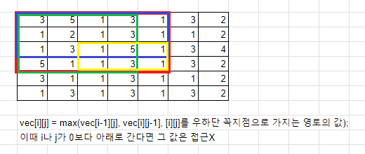 → i, j > 0일 때, vecSum[i][j] = vecSum[i][j-1] + vecSum[i-1][j] - vecSum[i-1][j-1] + vecTerri[i-1][j-1]