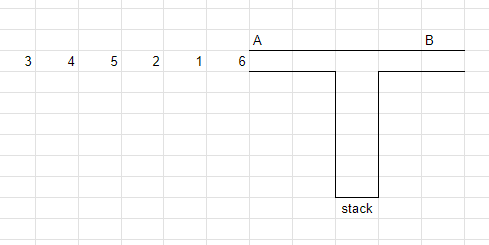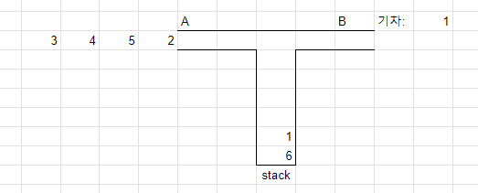 A에서 출발한 기차는 무조건 stack을 거쳐야 한다. 즉 6을 입력함과 동시에 교차로 stack에 A가 저장되는 것이다.
